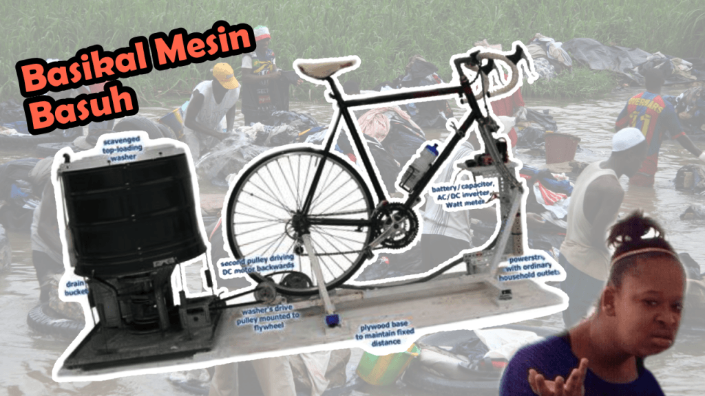 Akhirnya, mereka temui satu design yang bernas. Mereka gabungkan mekanisme putaran mesin basuh dengan basikal. Bermakna, mak cik – mak cik tersebut cuma perlu masukkan baju ke dalam tong, masukkan air (daripada tong air simpanan) dan sedikit sabun, dan kayuh selama ~20 minit untuk cuci baju mereka. Dapat jimat hampir 40 minit!