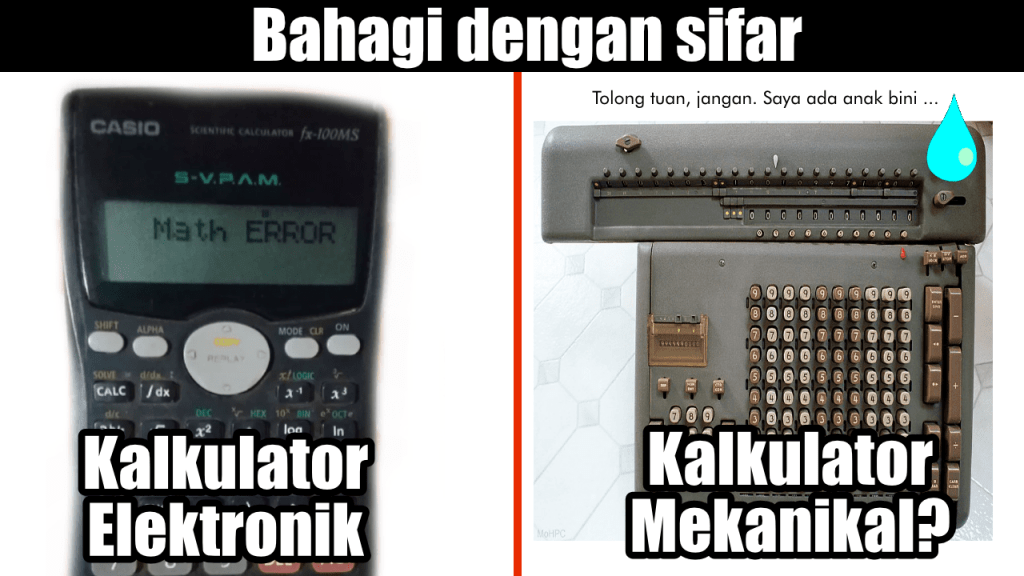 Tapi ada satu lagi soalan yang mungkin kita tak pernah tertanya. Apa jadi bila kita bahagi dengan sifar menggunakan kalkulator mekanikal? Kalkulator mekanikal, teknologi lama yang dah tak lagi digunakan tu? Yang macam mesin taip lama tu? (Apa tu mesin taip???)