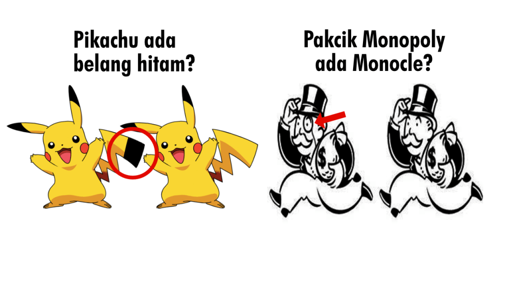 Gambar Pikachu mana yang anda rasakan betul? Jika anda pilih gambar kiri (belang hitam), maka pilihan anda salah, kerana Pikachu tidak pernah ada belang hitam di ekor.