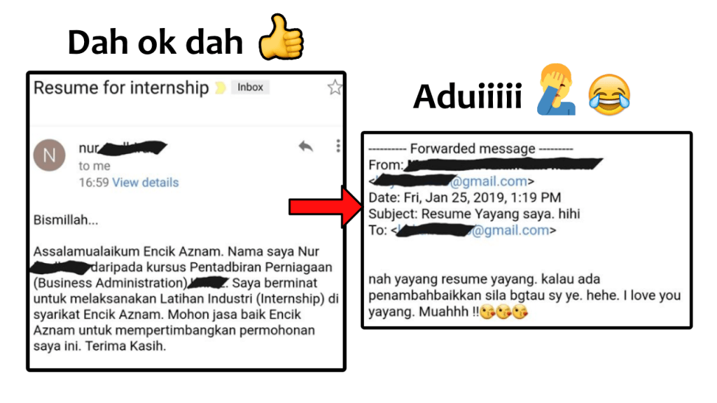 Rupa – rupanya pemohon tersebut meminta orang lain menuliskan resume untuknya (suami mungkin, husnuzzonn), kemudian diemelkan kepadanya, dan dia langsung menekan forward kepada pegawai syarikat tersebut.