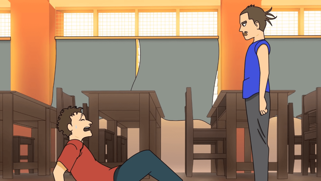 Kemudian lelaki tersebut didatangi oleh watak bermuka bengis yang entah datang dari mana, muncul dalam keadaan yang begitu menakutkan.