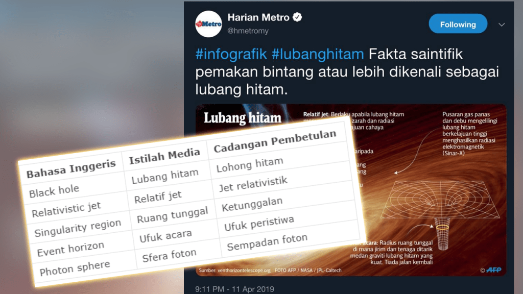 Dalam infografik yang diterjemah Harian Metro di atas, istilah seperti Event Horizon diterjemah menjadi ufuk acara, yang dianggap kurang tepat kerana dijangka ia adalah terjemahan langsung daripada Google Translate.