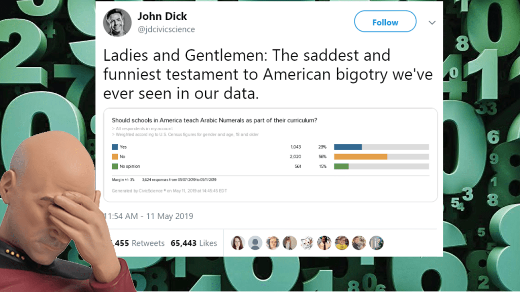 Bancian tersebut bertulis: “Adakah sekolah – sekolah Amerika perlu mengajarkan nombor Arab sebagai sebahagian daripada kurikulum mereka?”