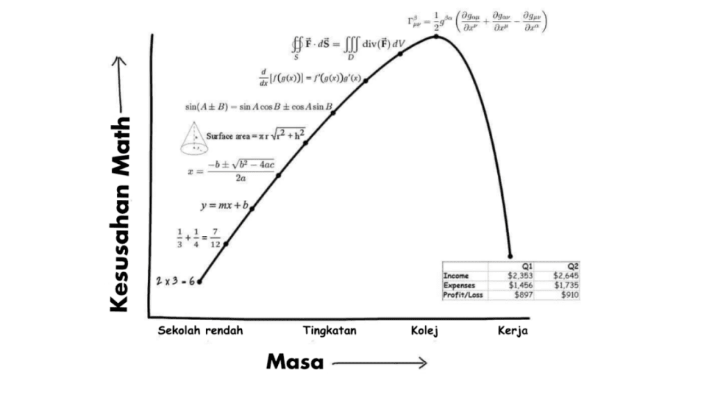 Sehinggalah akhirnya kita habis kolej dan masuk kerja. Lalu graf kesusahan matematik pun menjunam jatuh …