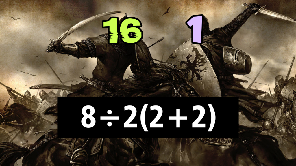 Jika ia ditulis (8/2)(2+2), maka jelas jawapannya adalah 4×4=16. Kerana nombor dalam kurungan itu diselesaikan dahulu.