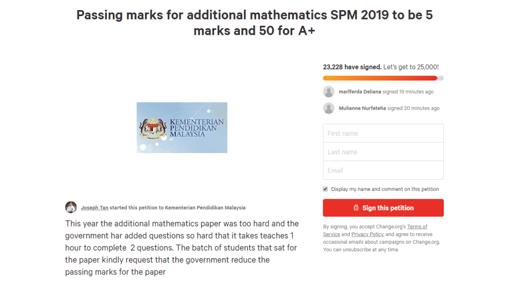 Sebuah petisyen telah dilancarkan di laman change.org yang mendesak agar Kementerian Pendidikan menurunkan markah lulus matematik tambahan SPM tahun ini kepada 5% dan 50% untuk peroleh A+.