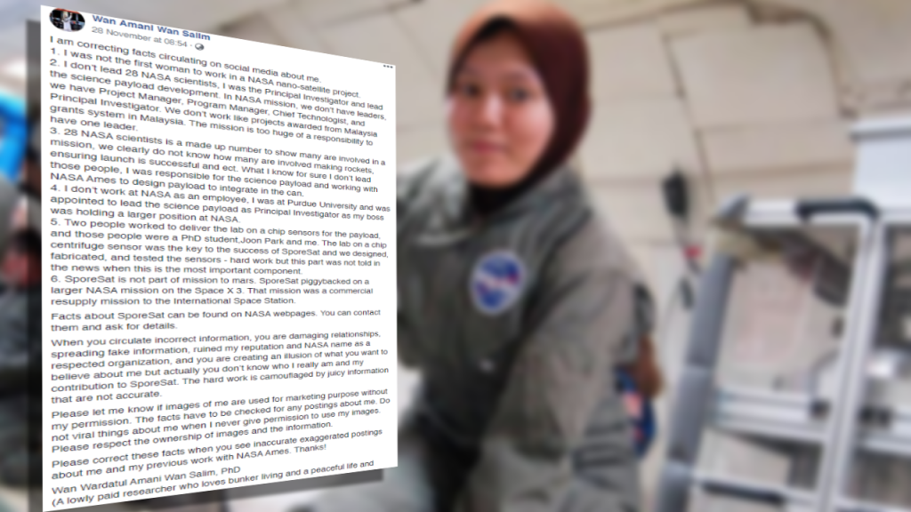 “Apabila anda menularkan maklumat yang salah, anda merosakkan perhubungan, menyebarkan maklumat yang palsu, merosakkan reputasi saya dan NASA sebagai organisasi yang dihormati, dan anda mereka cipta satu ilusi apa yang anda mahu percaya tentang diri saya tapi anda tidak kenali siapa diri saya yang sebenar dan sumbangan saya kepada SporeSat”.