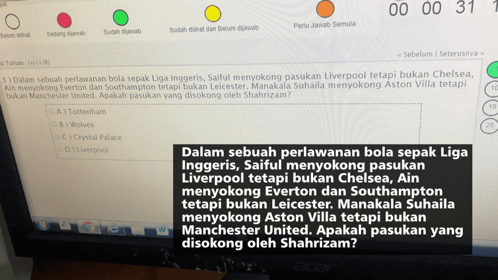 - Mengapa mesti Tottenham sebagai pilihan jawapan? Bagaimana jika disertakan jawapan E) West Ham? Maka sekarang mana satu pasukan yang digemari Shahrizam? Malah sebenarnya tiada masalah untuk Shahrizam menggemari keduanya, kerana pasukan kegemaran tidak semestinya satu.