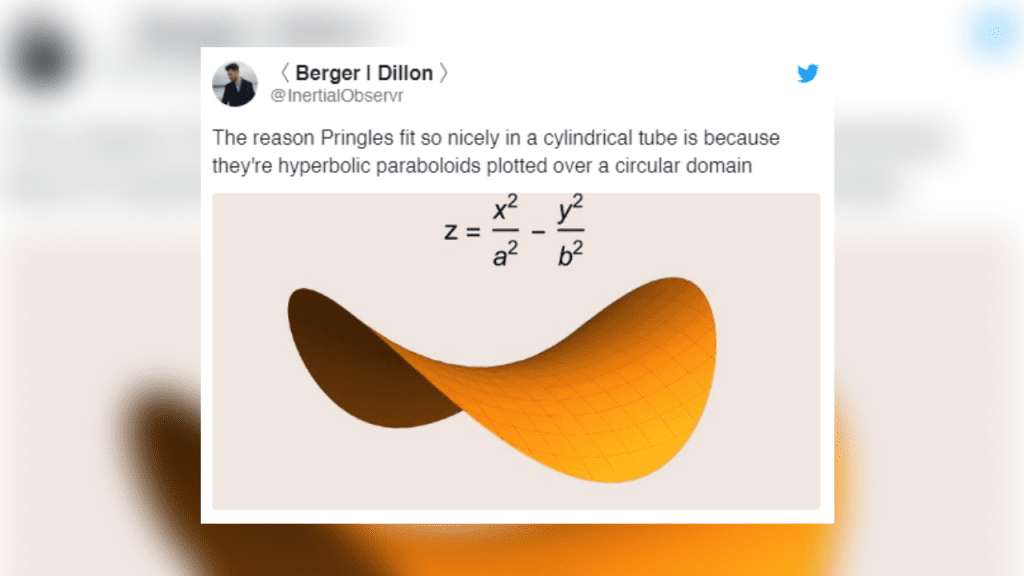 Menurut Berger Dillon, keropok Pringles sebenarnya berbentuk paraboloid hiperbolik yang diplot pada domain berbentuk bulat.