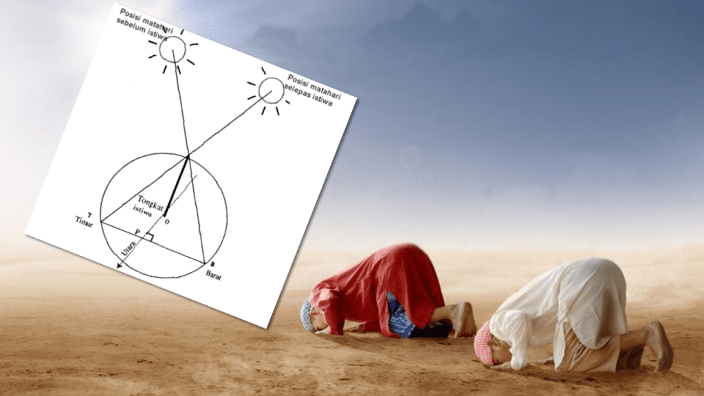 Setiap hari, Matahari akan melintasi langit pada siang hari. Kedudukan Matahari yang berubah-ubah ini akan menghasilkan panjang bayang yang berbeza pada sudut yang berbeza. Perubahan arah bayang ini boleh membantu memberi nilai arah kiblat yang sebenar. Langkah pertama ialah menentukan azimut Matahari pada waktu yang dikira. Maklumat azimut Matahari boleh diperoleh daripada berbagai aplikasi, antaranya ialah Daff Moon Phase dan SkySafari 6. Daripada maklumat azimut Matahari, hitung perbezaan sudut antara azimut Kaabah (291°-293°) dan azimut Matahari dengan menggunakan bayang-bayang yang dihasilkan oleh Matahari. Kemudian, dapatkan arah kiblat dengan mengikut perbezaan sudut ini, beserta kedudukan Matahari