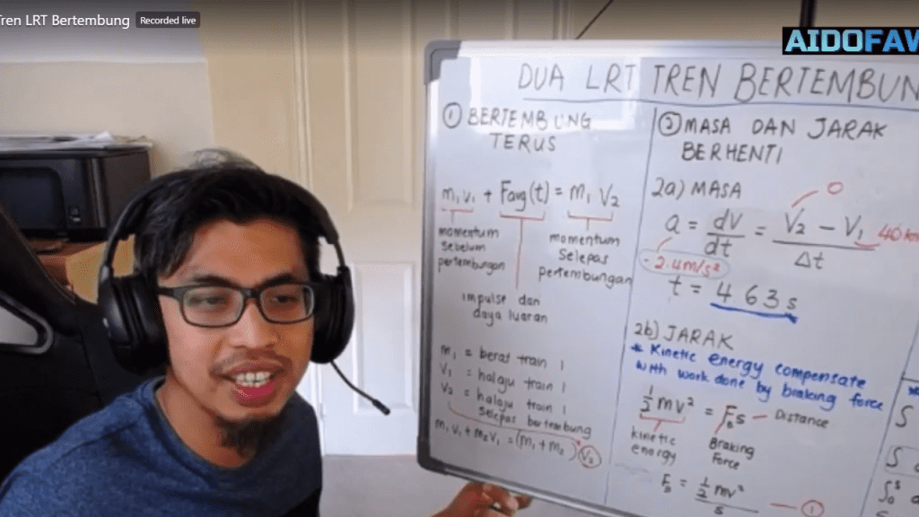 “Cuba bayangkan 21 tan bergerak dengan kelajuan 40 km/j, kita nak suruh dia berhenti, kan susah. Motorsikal nak berhenti dalam 4 saat, lajaknya hanya pendek. Kereta nak berhenti dalam 4 saat pun, pendek sahaja lajak. Tapi, semakin besar, lori, bas, dan sampai ke tren, nak berhenti, makin jauh dia, dalam masa 4 saat nak berhenti, makin jauh dia sebenarnya, berapa lajak dia ambik. Kenapa makin jauh dia tu, sebab berat dia.”- Dr. Aid Fawzal.